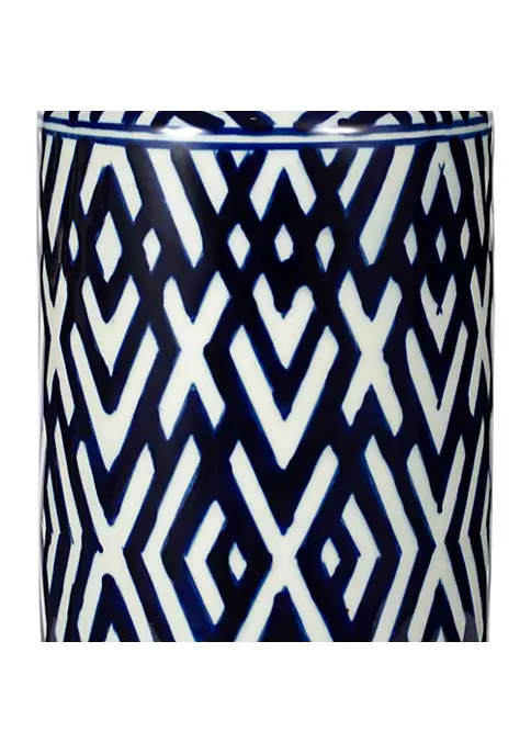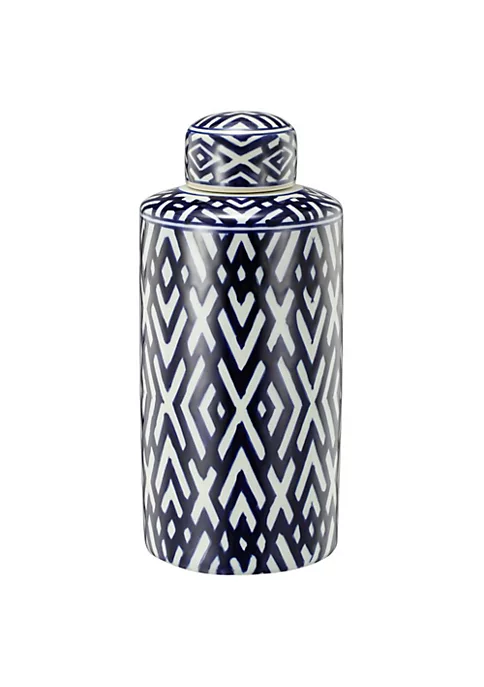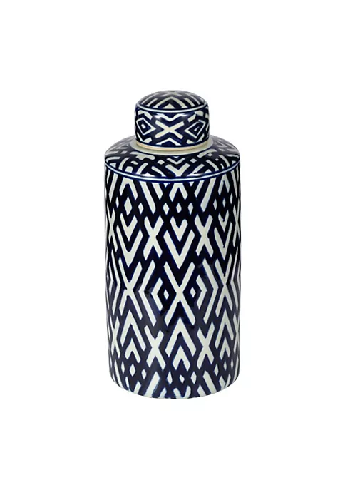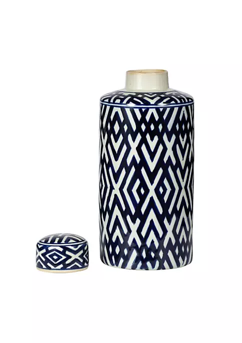 Jar crafted from durable ceramic glazed in a soft white and decorated with deep blue geometric patterns