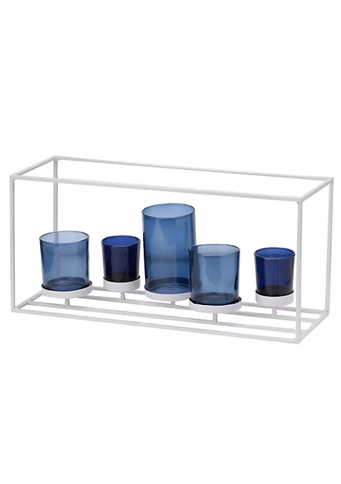 With its crisp white frame rich blue glass and a delicate shine this candleholder offers an understated style that complements nearly any home or office. Features a matte white iron frame with 5 glass votive holders in two shades of blue. Place this candleholder on your mantle coffee table kitchen island or surround it with flowers to create a lush custom look.