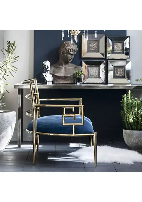 Blue upholstery and glossy gold finish take cues from the Mediterranean landscape