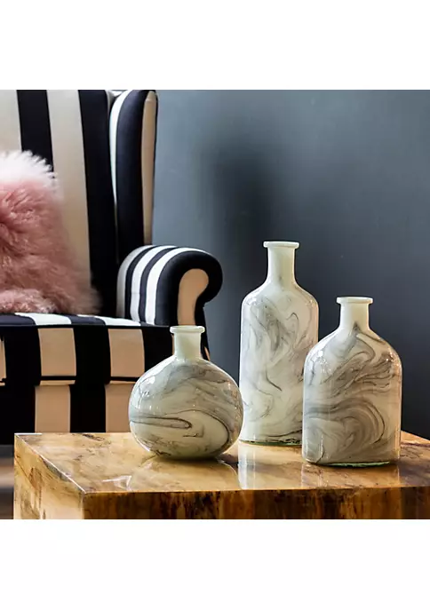 Smoky black and white lines swirl through this beautiful glass vase almost as if it were carved from high-end marble. The vintage design makes this piece of art stand-alone or perfect to accompany a bunch of freshly bloomed flowers. Give your home the luxury it deserves.