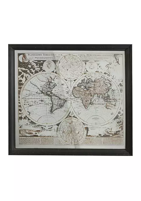 Features a mirror with vintage-style world map print