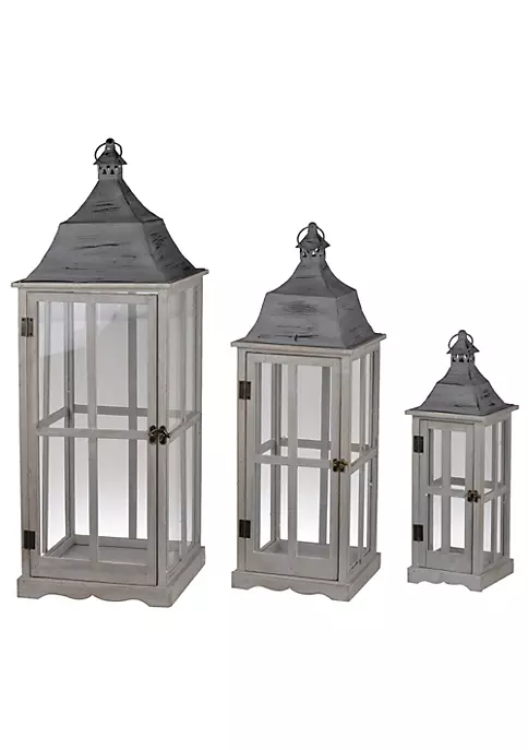 Lanterns feature a wooden frame with a gray finish